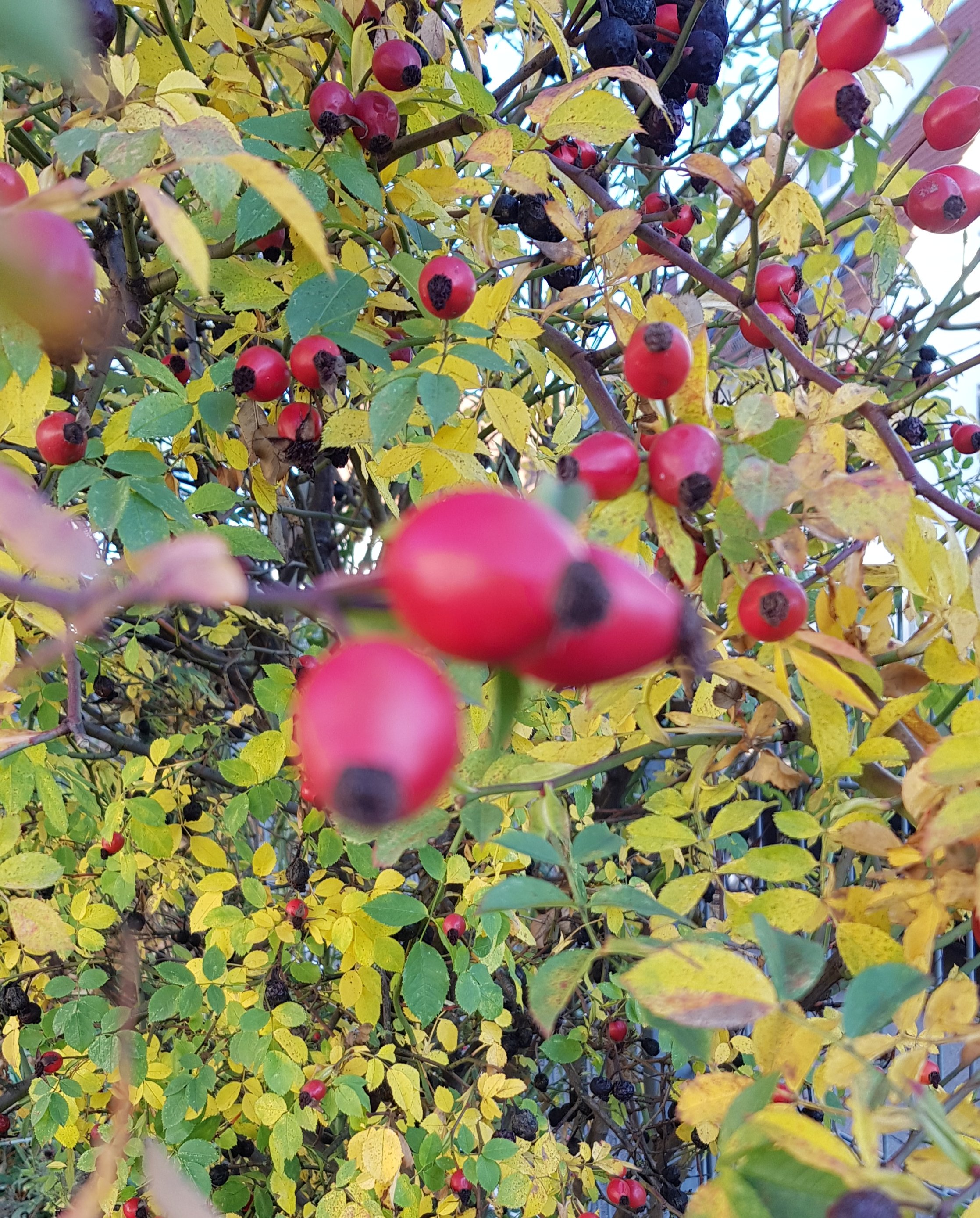 Der goldene Herbst hat nun auch im Garten Einzug gehalten. Nun werden die letzten Tomaten und Blumen geerntet und die Beete langsam abgeräumt. Der schöne Rosenstrauch trägt noch seine leuchtend roten Hagebutten und schmückt noch den Garten.